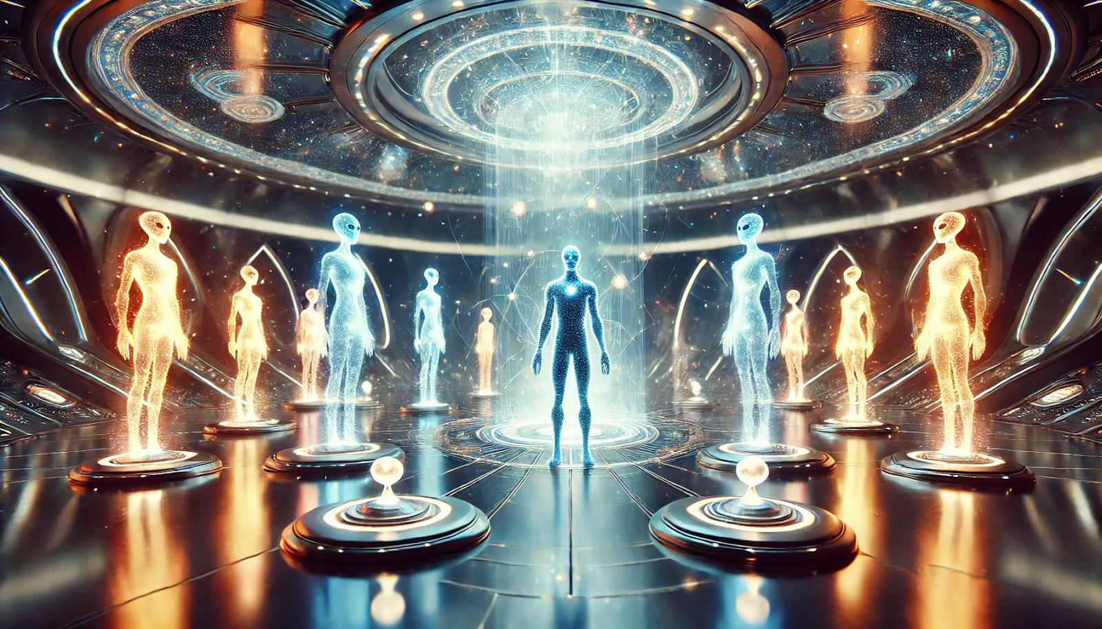 As their crafts entered the dimensional gateway to their homeworld, the expanse of the council chamber unfolded around them. The chamber was an infinite void, filled with shimmering energy forms, each representing a member of the council. Their collective voices resonated in unison, a melody of thought.